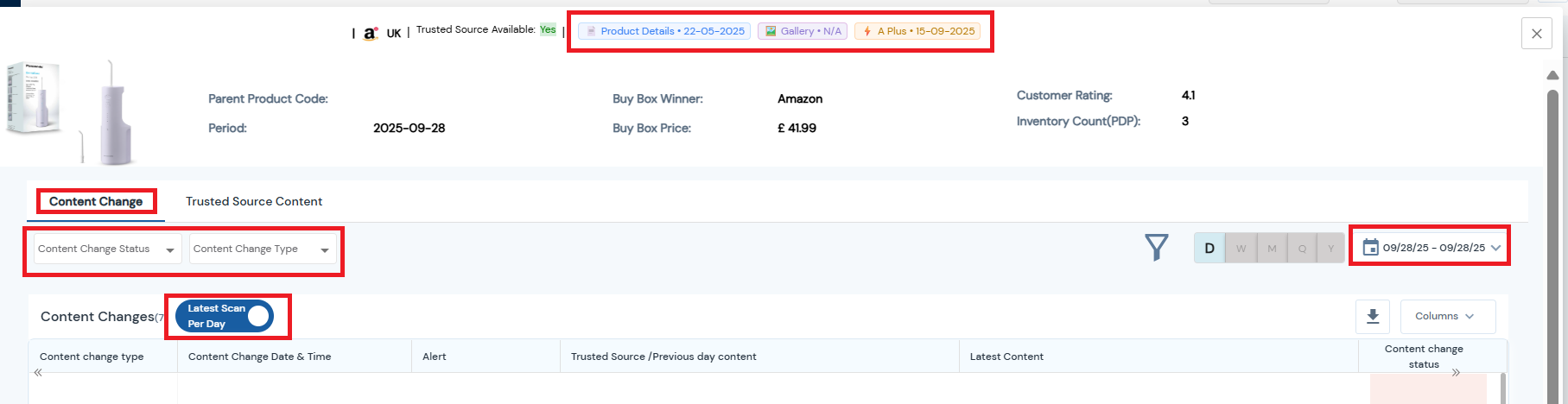 3. In the "Content Changes" column, you will see the type of content changes (e.g., title, description, images etc.) highlighted in red, yellow, or green. These colors indicate whether the change is non-conforming (red), lacks a trusted source (yellow), or is conforming (green).