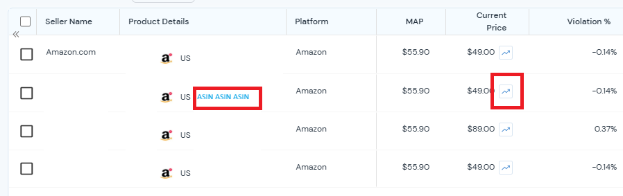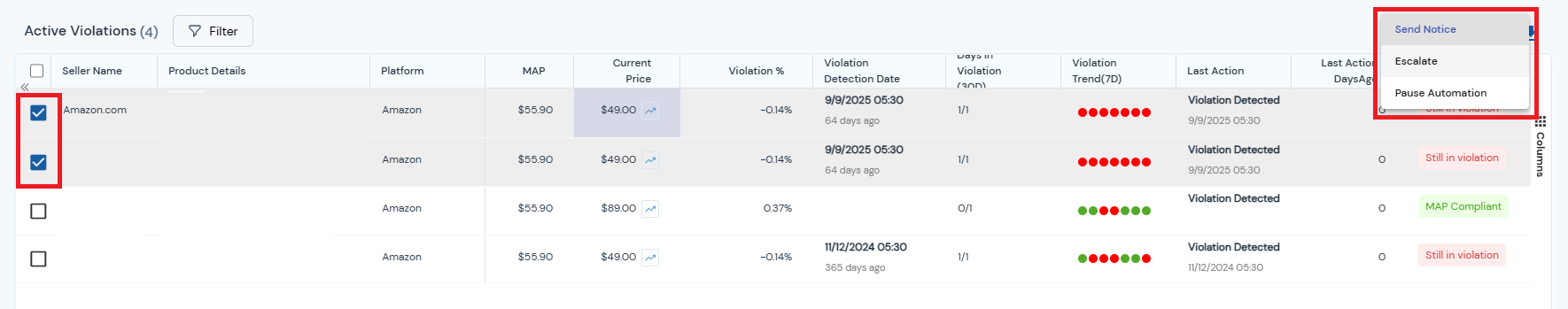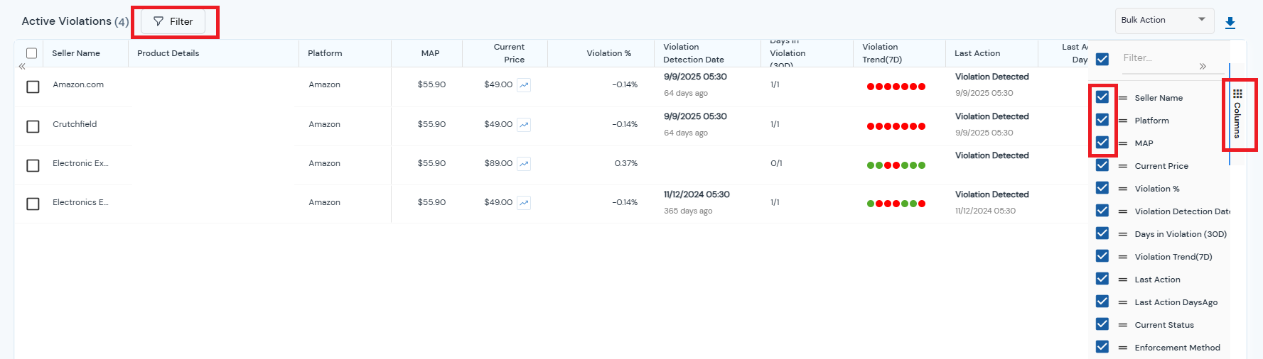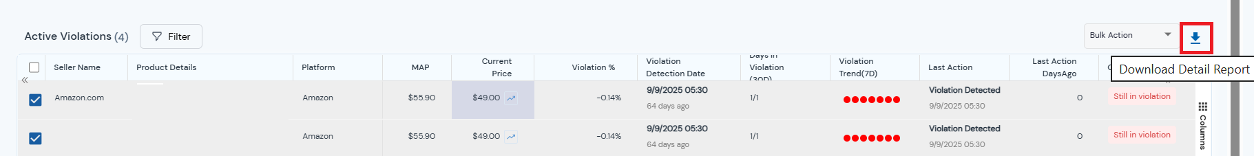Review fields such as Current Price, Violation%, Violation Detection Date, Violation trend dots, Last Action, and more in the view details table.