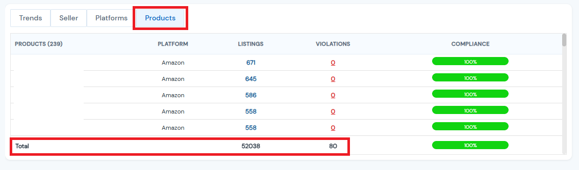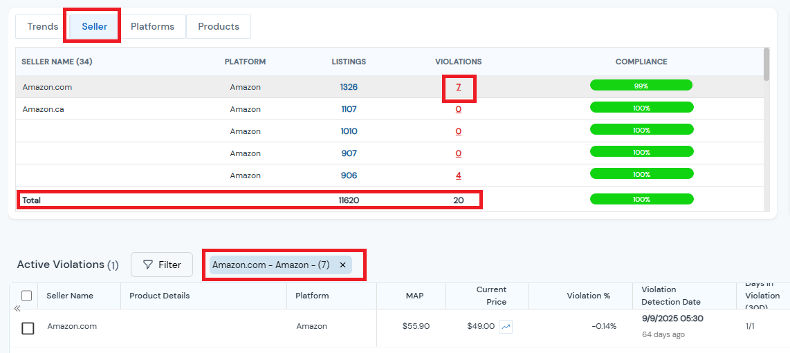 - Scroll to the table to see violation details per seller × product × marketplace.