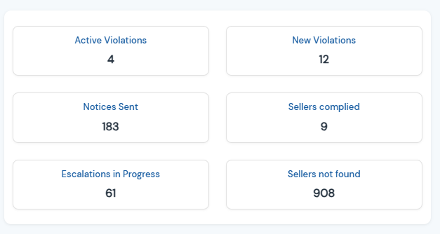 - Review the KPI cards on the right for Active Violations, New Violations, Notices Sent, Sellers Complied, Escalations in Progress, and Sellers Not Found.
