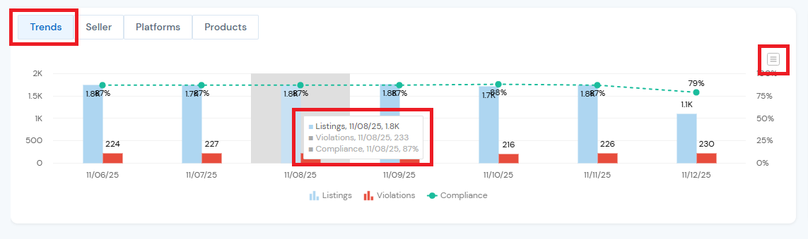 Use Trends to identify spikes, then pivot to Seller or Platforms to focus enforcement, and use the table to act on specific rows.
