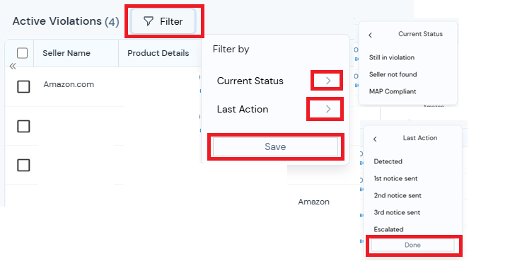 Current Status options: Still in Violation, Seller Not Found, MAP Compliant.
