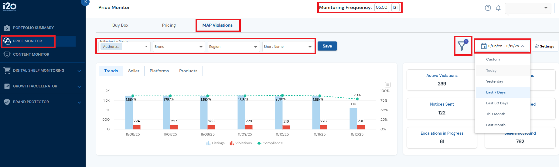 The MAP Violations tab shows Minimum Advertised Price (MAP) violations across platforms, sellers, and products in one place. It lets you filter data, review trends and KPIs, drill into row-level details, and take actions such as sending notices, pausing automation, escalating, or closing items.